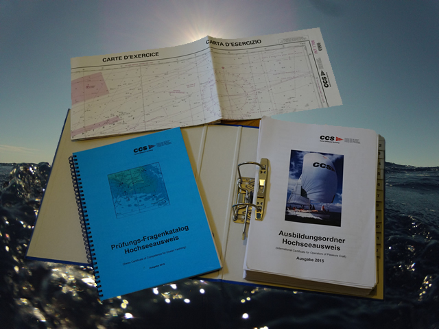 Da der CCS auch Ausbildungskurse zur theoretischen Hochseescheinprüfung durchführt, gibt es auch entsprechendes Ausbildungsmaterial in Form eines dicken Kursordners im Klubshop zu erwerben. Ebenso kann man dort die jeweils aktuellen Prüfungsfragen, die Übungskarte und das nautische Hilfsmaterial bestellen. Als nicht nötige Zusatzausgabe erachte ich den Erwerb der Zusatzkarte CCS.